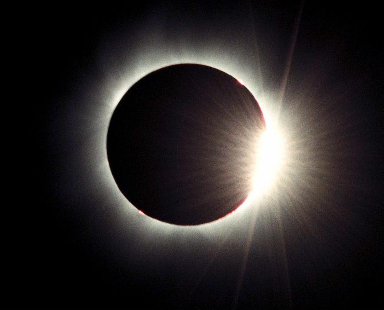Een zonsverduistering vindt plaats doordat de maan tussen de zon en de aarde staat.